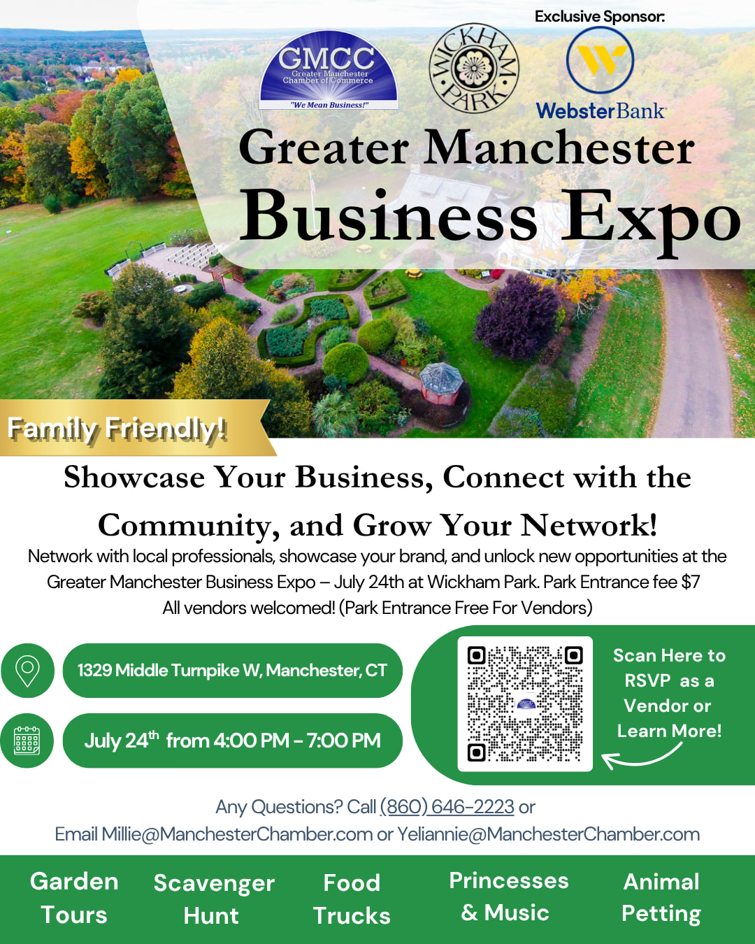 Join us on Thursday, July 24th, 2025 from 4:00 PM – 7:00 PM at Wickham Park for the Greater Manchester Chamber’s 2025 GREATER MANCHESTER BUSINESS EXPO, proudly presented by our Executive Sponsor, Webster Bank!